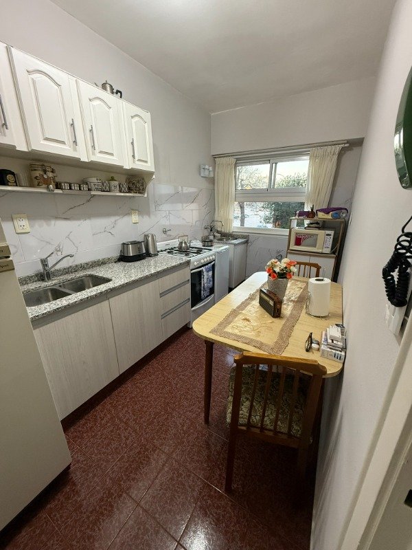 El departamento esta compuesto por cocina con lavadero, living-comedor con balcón, pasillo de distribución, baño completo y 2 dormitorios con placares embutidos en la pared y balcones. El mismo cuenta con los servicios de agua corriente, cloacas, electricidad, gas y pavimento.